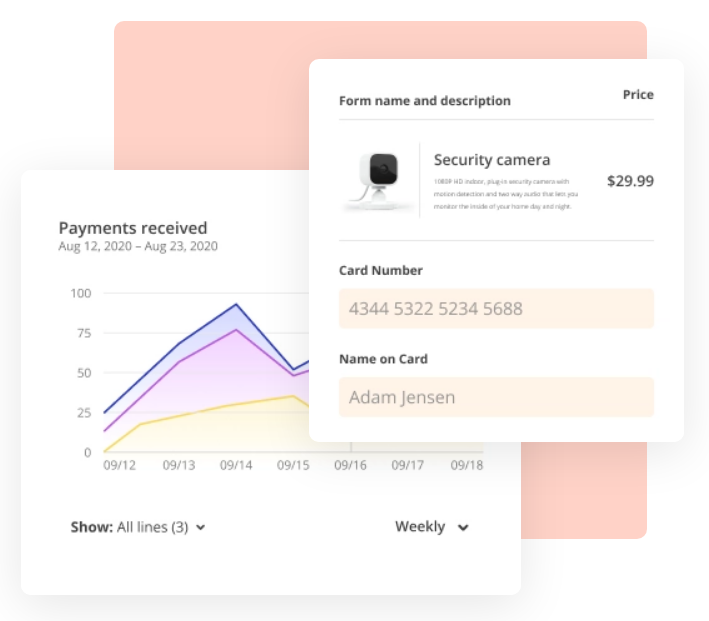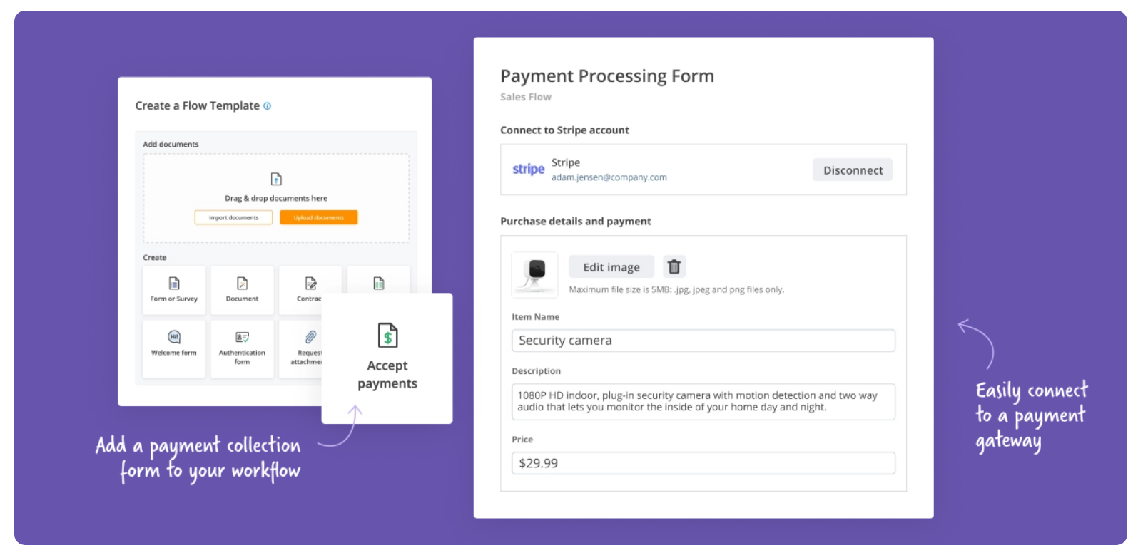 Integrate payment collection into contract negotiation, quote creation, invoicing, or accounting processes. Allow your customers to pay quickly and eliminate delays and risk of nonpayment. Automate quoting and payments without having to write a single line of code.